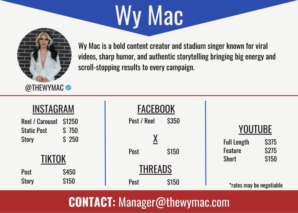 I’m Wy Mac — a singer, storyteller, and content creator blending heartfelt vocals with viral energy. From stadiums to screens, I’ve gone viral for everything from National Anthem performances to character-driven content, and I’m on a mission to make moments matter.